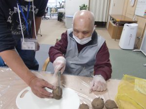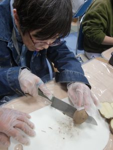 じゃが芋を包丁で半分に切っていく!!