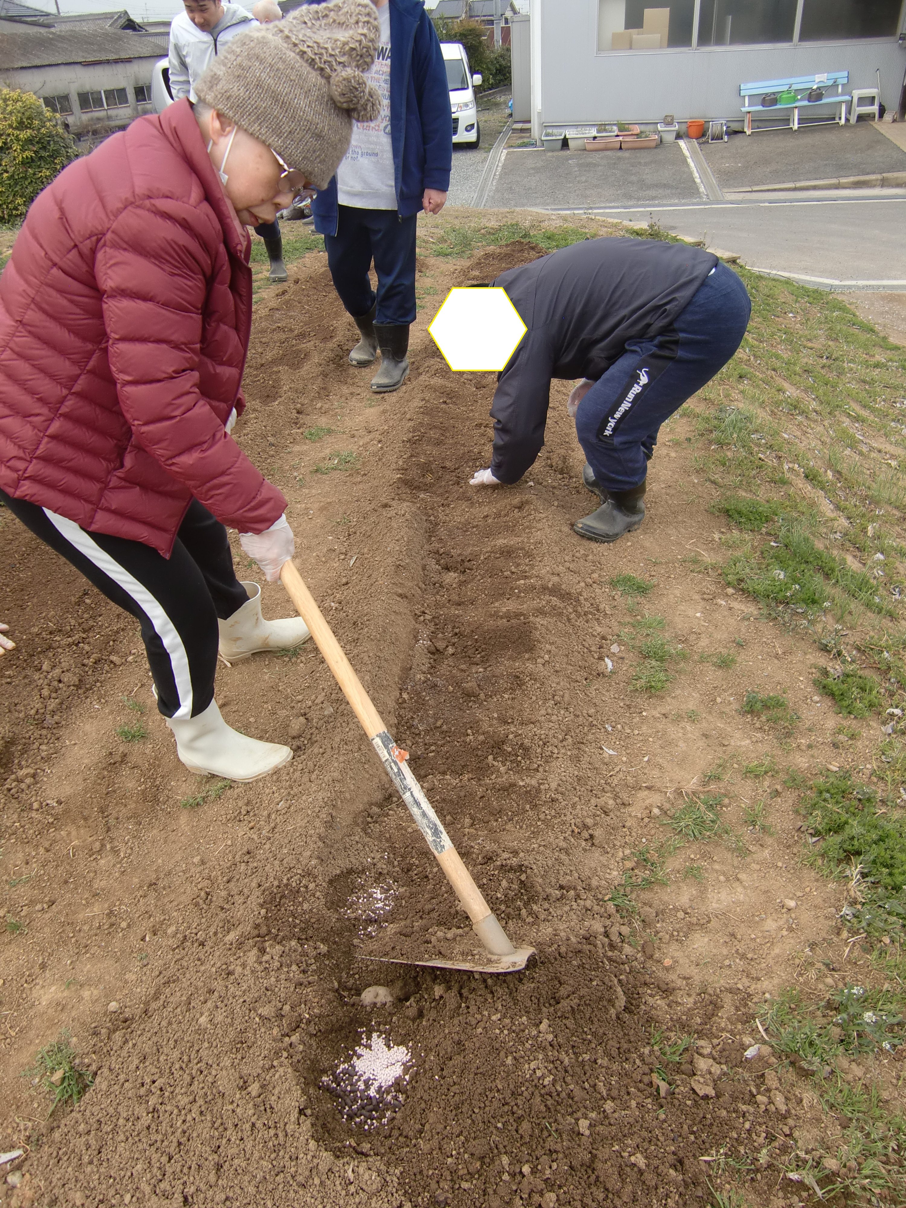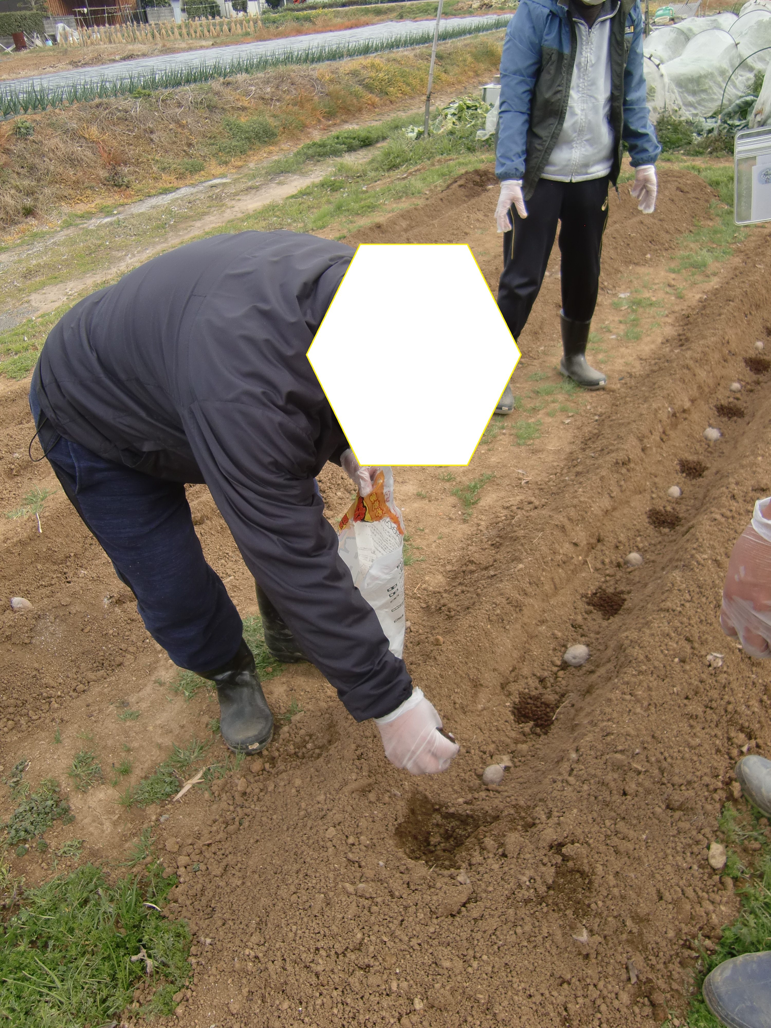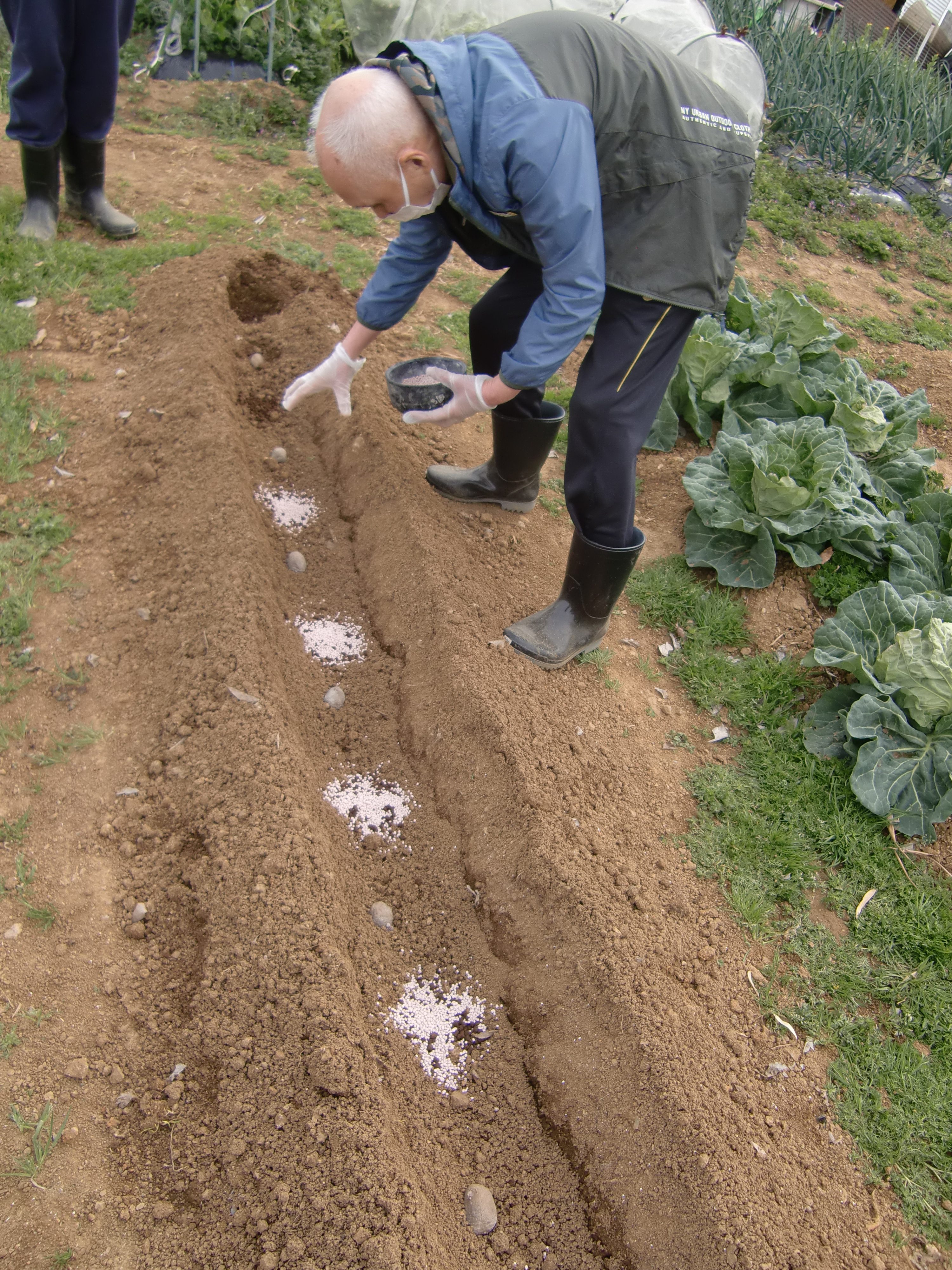 じゃが芋とじゃが芋の間には肥料をまいていきます🥔