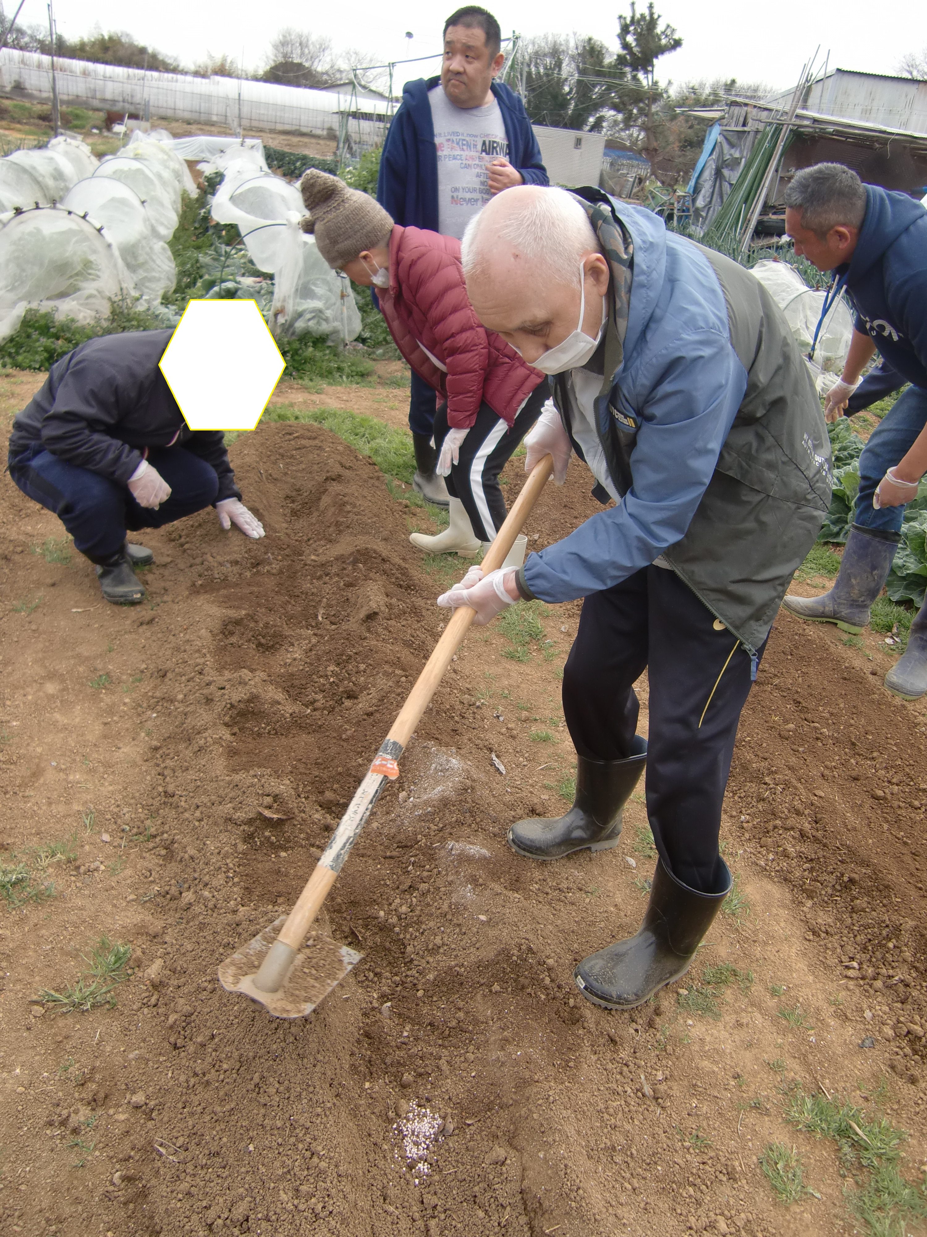 鍬で土をかけ、その後から手で綺麗にする!!