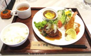 えびフライ・白身魚フライにハンバーグ、キーマカレー、サラダ、スープ、ご飯。大人のためのお子様ランチにワクワク感が急上昇☺️